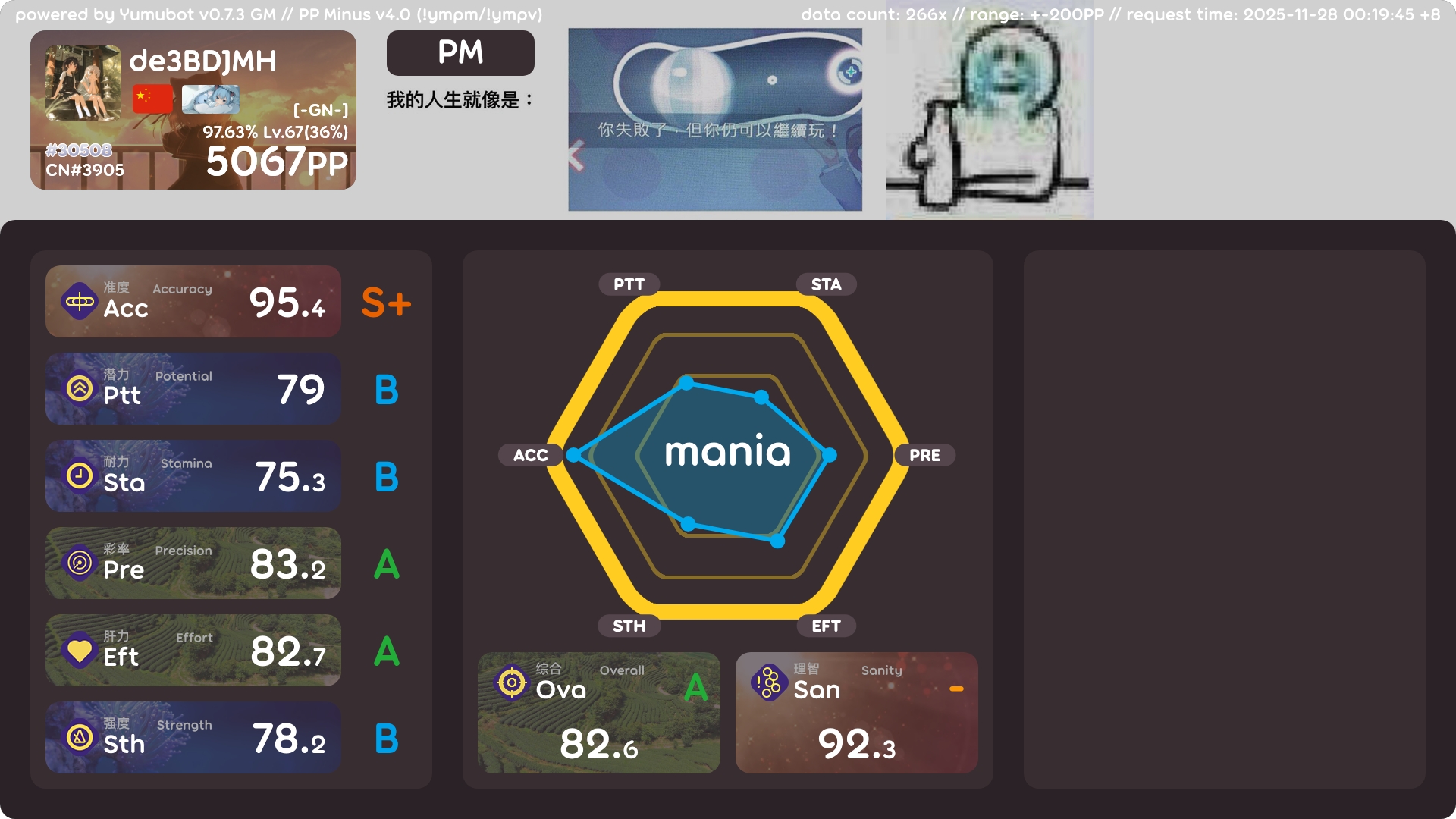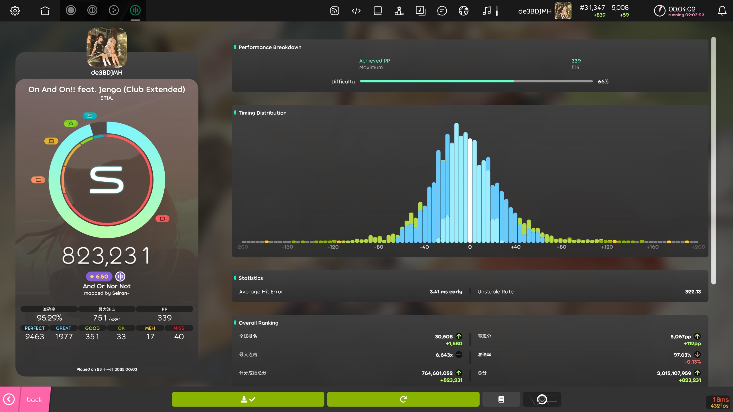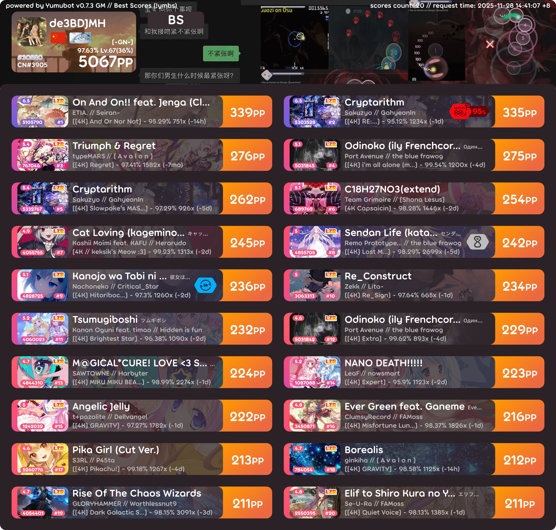 4k 5000pp啦 2025年11月28日 46 字 大概 1 分钟 顺利5000~ 没什么卡顿没什么感言呢…进步很快! 感谢雾尘推荐的on and on!一把推了100多pp!!! !bs怎么还是只有20个!!! !ba !k !pl !pm