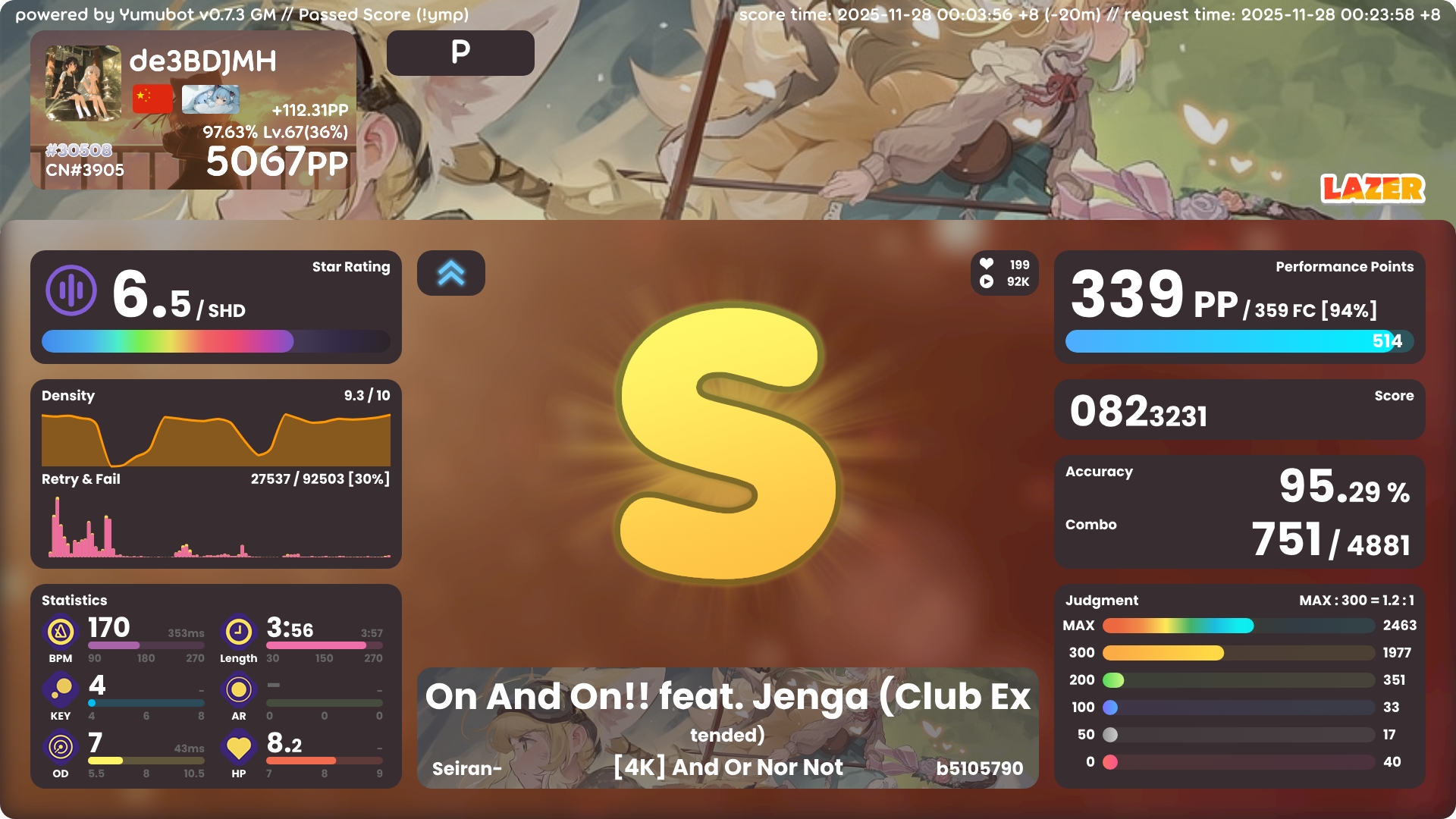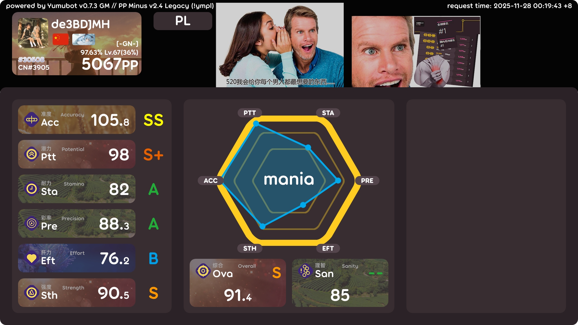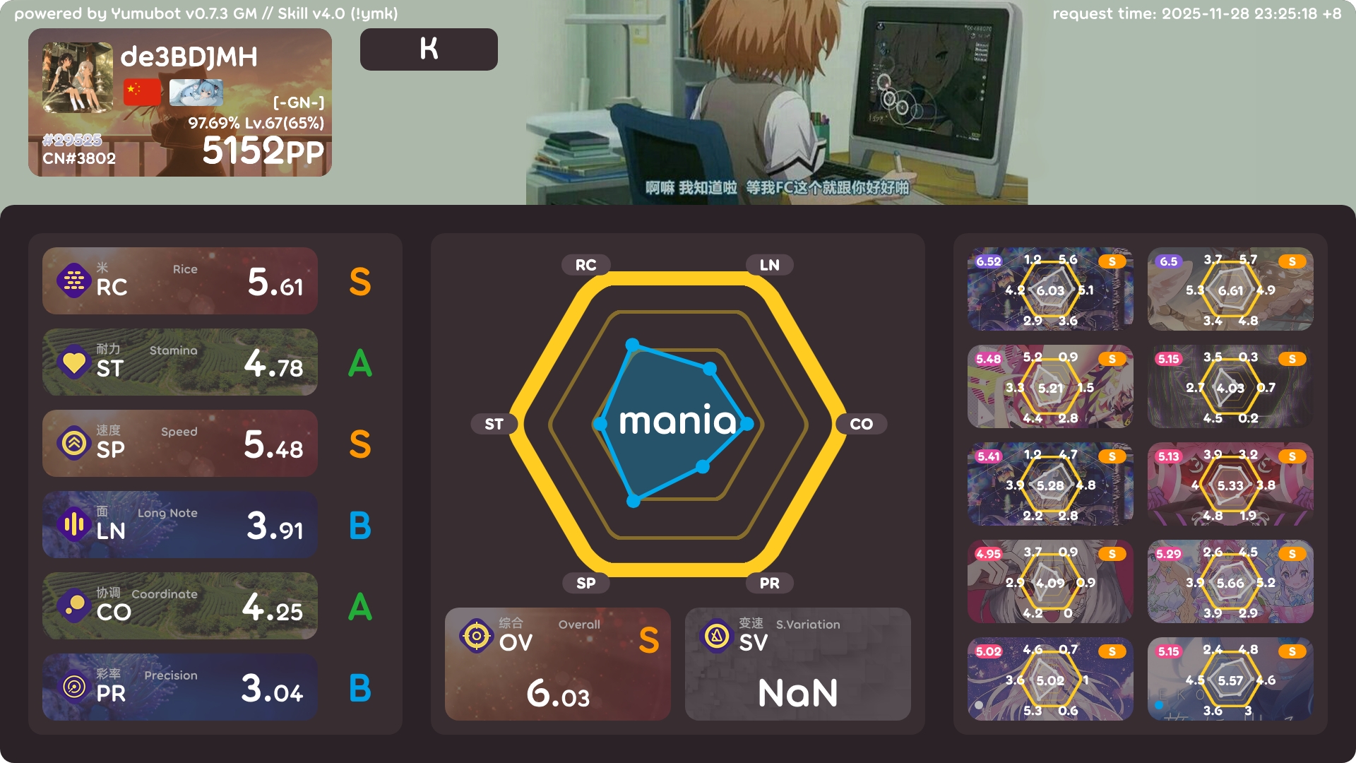 4k 5000pp啦 2025年11月28日 46 字 大概 1 分钟 顺利5000~ 没什么卡顿没什么感言呢…进步很快! 感谢雾尘推荐的on and on!一把推了100多pp!!! !bs怎么还是只有20个!!! !ba !k !pl !pm